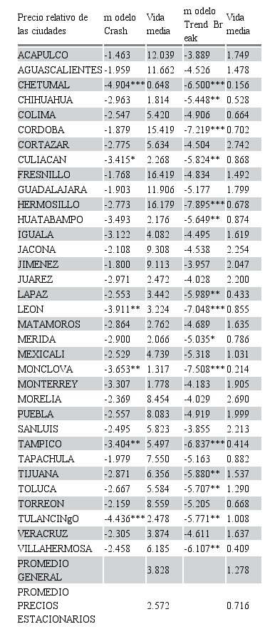 Para el caso del modelo Trend Break, que permite dos cambios estrucurales en la constante y en la pendiente, se rechaza la hipótesis nula de raíz unitaria para 15 de 34 ciudades. De acuerdo al cuadro anterior, se puede señalar que para 15 de las 34 ciudades de México no se puede refutar la teoría de la paridad relativa intranacional, indicando que hay integración comercial y convergencia de precios en el largo plazo entre los mercados de estas ciudades y la Ciudad de México.