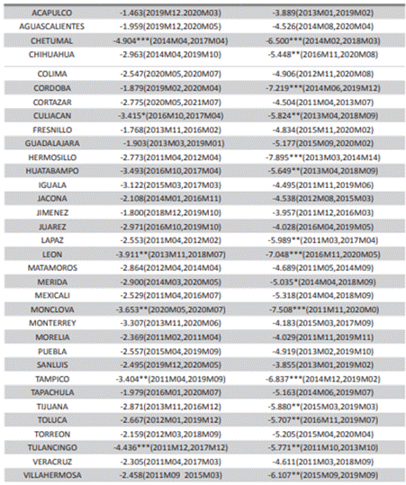 Aplicando la metodología de Lee y Strazicich (2003) para pruebas de raíz unitaria que permiten dos cambios estructurales, los resultados se presentan en el cuadro 3. Para el caso del modelo Crash que permite dos cambios estructurales en la constante, se rechaza la hipótesis nula de raíz unitaria sólo para 6 de 34 ciudades.