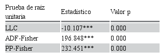Nota: la hipótesis nula es que existe raíz unitaria en la variable y la alternativa es dicha variables es estacionaria para las pruebas LLC, IPS, ADF-Fisher y PP-Fisher.