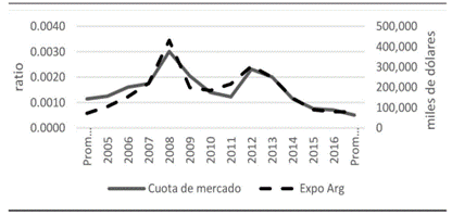 El pronunciado crecimiento de las exportaciones del complejo de maquinaria agrícola, desde el 2002, colaboró a que la participación de t en el mercado mundial tuviera un crecimiento significativo (línea roja). Sin embargo, la crisis internacional de 2008 cambió abruptamente el escenario, traduciéndose en un decrecimiento de la cuota de mercado internacional. La situación mejora eventualmente hacia el año 2012 pero luego continuó desmejorando.