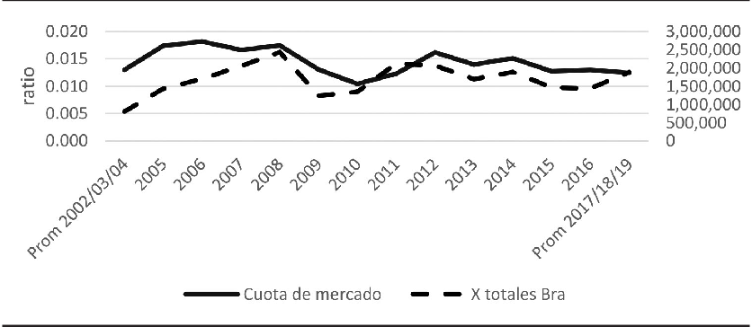 Observando el caso de las exportaciones totales de Brasil (línea negra punteada) en la figura 2, se puede ver como experimentan un crecimiento tendencial desde el año 2002. Este comportamiento no se ve reflejado en la cuota de mercado (línea azul).