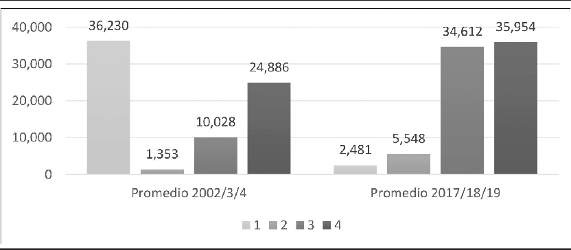 Debido a que los resultados pueden ser sensibles a la elección del período, para la descomposición se utilizaron los valores promedio para los extremos: 2002-2004 y 2017-2019 siguiendo la recomendación de Fagerberg y Sollie (1987).