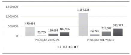 En discrepancia con lo anterior, los segmentos 2 y 3 presentan un importante aumento en sus exportaciones, aproximadamente un 300% y 245%, respectivamente. En cuanto a los países que se destacan en el primero, son los pertenecientes a los grupos C y A. Mientras que, en el segmento 3 se destacan los grupos C (0.34%), en primer lugar y, luego el B (0.27%). Resulta importante destacar el efecto competitivo de ambos segmentos, ya que el segmento 2 logró posicionarse como el de mejor desempeño con un 30%, seguido del segmento 3 con un 14%.