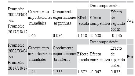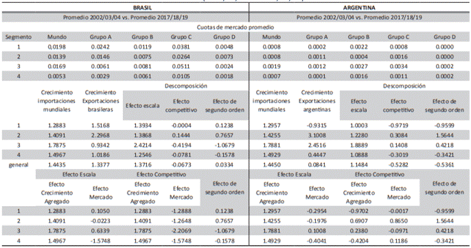 En la tabla 1 se muestran los resultados del primer nivel de descomposición del crecimiento de las exportaciones argentinas y brasileñas. Se puede ver el aumento considerable de la demanda global realizada por los mercados abastecidos por Argentina (145%) y por Brasil (144%). Sin embargo, las exportaciones argentinas aumentaron tan solo un 8.4% punta a punta. En cambio, ese indicador para Brasil resultó ser mucho más elevado, cercano a un 134%.