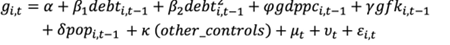 (1)where 𝗀i,t is the growth rate of GDP per capita; debti,t is gross government debt as a share of GDP; 𝗀dppci,t is the initial level of GDP per capita; 𝗀fki,t is investment rate (proxied as gross fixed capital formation) as a share to GDP; popi,tis population growth rate; other_controls include real exchange rate, economic openness, democratic government indicator and inflation rate; is country fixed effects; is time fixed effects; and is the error term.