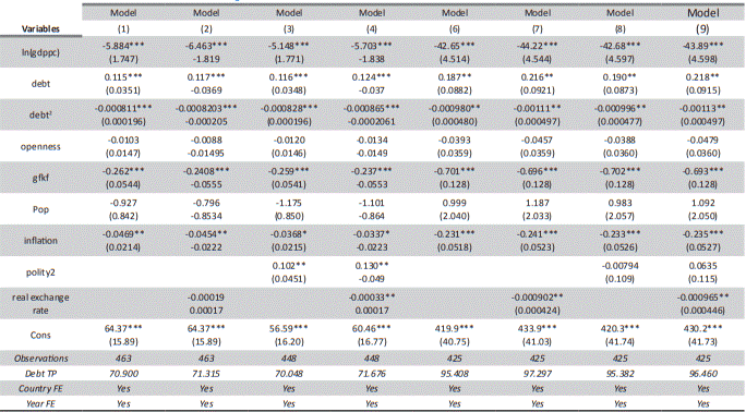 We use a quadratic equation in debt since we are interested in checking whether there exists a non-linear impact of government debt on growth. Other control variables include: (i) variables measuring the economic openness; (ii) a variable signaling the existence of democratic governments; and (iii) policy environment variables.
