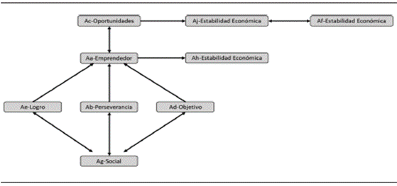 En este mismo contexto, la percepción de los universitarios sobre el emprendimiento y el perfil emprendedor de los parientes inmigrantes de EE. UU. adquiere una mayor significancia cuando observamos la red semántica que relaciona y asocia nueve códigos sobresalientes.