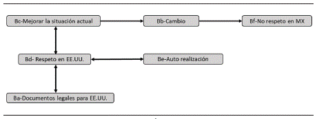 Se identificaron mecanismos conductuales ligados al esfuerzo que han desarrollado lo entrevistados en su calidad de estudiantes (nivel universitario) como: la mejora de la situación actual del universitario, los documentos legales para acceder a EE.UU. y el respeto que se le brinda a los trabajadores en ese mismo país, comparado con el no respeto por el trabajador en México, todo lo anterior con miras a la autorrealización; principalmente motivados por la oportunidad de laboral al emigrar hacia EE. UU. lo cual, disminuye todo el cambio que la persona debe de afrontar en este proceso de emigración e inmigración (ver figura 2).