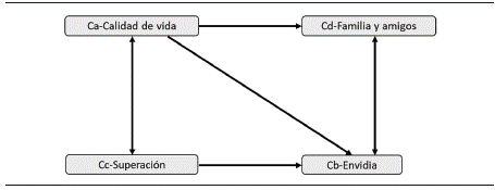 En este mismo análisis, surge un elemento sumamente interesante, la envidia. En la Figura anterior, podemos observar como la calidad de vida y la superación que pudieran obtener las personas que emigran a EE. UU. son causa de envidia por partes de los mismos referentes importantes (familia y amigos). Surgiendo aquí, una nueva línea de investigación, para conocer como la envidia de los referentes importantes influye en los procesos de emigración, inmigración y retorno. Algunos de los entrevistados, al señalar que era mal visto emigrar a los EE. UU. fue a razón de las envidias de parientes y amigos al observar la superación personal y desarrollo económico de aquellos que inician y logran laborar en el país del norte.