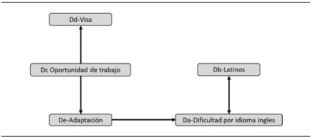 La red semántica (ver figura 4), nos muestra los principales elementos que intervienen en el CCP del universitario analizado. La mayoría visualizan, partiendo de las oportunidades que les ofrece el entorno y de las conexiones parentales tener una oportunidad de trabajo en EE. UU. aunado al contar en su mayoría de los entrevistados con visa; en este mismo orden de ideas, también se identifica a la migración como un proceso, donde se tendrá que pasar por una adaptación, donde interviene una dificultad por el idioma inglés. Sin embargo, visualizan, a la comunidad latina (hispanohablante) que radica en EE.UU. como una alternativa que amenora la dificultad por el idioma.
