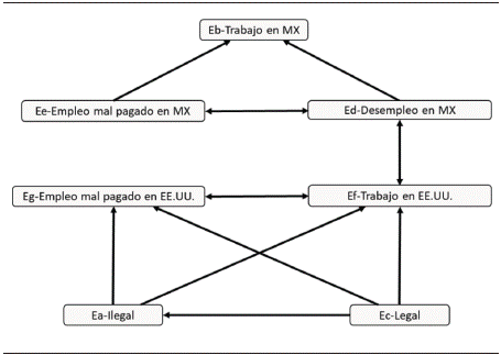 El contraste laboral, percibido entre México y los EE. UU. se concibe radicalmente diferente. El primero, en detrimento de todas las prerrogativas económicas y culturales, el segundo, se vuelve como la mejor alternativa a decidir como el camino más viable. Lo anterior, es el elemento principal por el cual, los universitarios emigrarían; identificando, la existencia de altos índices de desempleo aunado a los bajos salarios que brindan los empleos existentes en México. En el escenario mencionado, el trabajar en EE. UU. se asocia como una alternativa que puede brindar la obtención de un empleo bien pagado, Sin embargo, los entrevistados consideran que la remuneración económica y la obtención de un empleo,dependerá de su estatus migratorio legal o ilegal (ver figura 5).