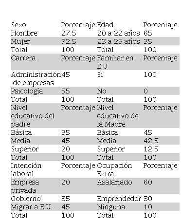 La edad de los sujetos de estudio oscila entre 20 y 25 años, loscuales cursan el penúltimo cuatrimestre para finalizar las carreras de Psicología y Administración de empresas. Con una composición en sumayoría de mujeres en un 72.5 %. Los estudiantes universitarios en sumayoría trabajan 60%, otros son emprendedores con un negocio propio 30% y solo el 10 % se dedica solo a estudiar su carrera profesional. La intención laboral que tienen estos sujetos de estudio es minina en relación a emplearse en una empresa privada y en áreas de gobierno con un 20 y 35% respectivamente; resulta interesante analizar que la mayoría, tiene la intención de emigrar a los EE. UU. para emplearse 45% (ver tabla 1).