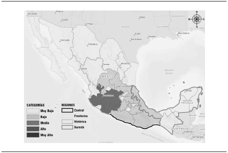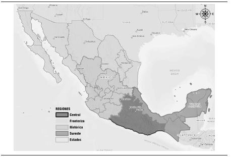 Las remesas son el resultado principal de la migración entre dos puntos en el espacio territorial, que a su vez se encuentran localizados dentro de sistemas de relaciones de mutua conveniencia, que presentan una perspectiva de complejidad. Cuando se trata de migración internacional, a los sistemas estatal y nacional se agrega un sistema externo. Si se pretende estudiar el crecimiento y distribución de las remesas desde un enfoque regional, es preciso hacerlo también desde un enfoque de sistemas, porque cada uno tiene sus elementos y sus interrelaciones, por lo tanto el resultado es producto de la suma de las dinámicas de cada uno de ellos. Una técnica que aproxima a la descomposición del crecimiento de una variable en el ámbito regional, es el del análisis de cambio y participación conocido como Shift-Share Analysis, en este caso la variable a analizar son las remesas que han recibido las 32 entidades del país, y además agrupadas en las regiones de la migración propuestas por Durand y Massey (2003) (véase mapa 1), que de paso permitirá comprobar si siguen manteniendo su vigencia al considerar la asincronía, la intensidad y la velocidad de evolución de la migración en los espacios territoriales de México.