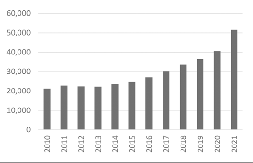 El periodo de estudio abarca 2010 a 2021. Entre 2005 y 2010 los flujos de migrantes a los EEUU ascendieron a 964,869, fueron años en que la economía norteamericana entró a una crisis económica-financiera en el 2008, los migrantes que pudieron entrar a partir de 2010 y los que permanecieron en los EEUU de años anteriores, estuvieron enviando remesas cuyo comportamiento seguía al ciclo económico con sus fluctuaciones; a partir del 2014 recuperaron los niveles previos a la crisis e iniciaron un crecimiento sostenido lento y más pronunciado a partir del 2016 (ver gráfica 1).