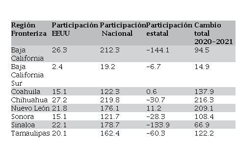 En la región Fronteriza, cuadro 8, sucedió algo parecido a la anterior, como ya se mencionó para las participaciones EEUU y Nacional la afectación fue igual, destacando que los mayores montos correspondieron a Chihuahua y Baja California, al igual que en el período anterior. Las diferencias importantes aparecieron en la participación estatal, donde 6 de 8 estados resultaron con signos negativos y sólo con positivos Nuevo León 11.2 mdd y Coahuila 0.6 mdd, en contraste con el periodo 2010-2019 cuando fueron todos positivos. La explicación de estos resultados también podría estar relacionada con que se trata en general de estados con una población migrante en los Estados Unidos más estable, con gran circularidad, que envía remesas a un ritmo regular creciente, que en el período de 2020 y 2021 su ritmo no fue mayor como en otros estados.
