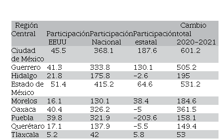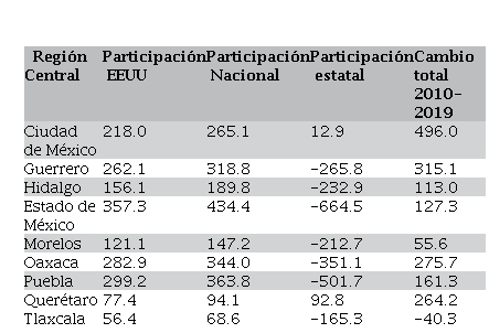En la región Central, cuadro 4, el cambio total en las remesas entre 2010 y 2019 fue positivo en 8 estados, siendo negativo sólo en Tlaxcala -40.3 mdd. Los mayores montos fueron de la Ciudad de México, Guerrero, Oaxaca y Querétaro. En esta región lo que destacó fue que en la participación estatal 7 de los estados resultaron con cantidades negativas, siendo los montos más altos en el Estado de México, Puebla y Oaxaca. Esto es, que durante los años del período la mayoría de los estados fueron receptores netos de remesas con crecimientos muy bajos de las mismas, relacionado probablemente por la menor cantidad de migrantes hacia el país del Norte.