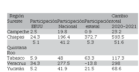 Finalmente, en la región Sureste, cuadro 10, el crecimiento de las remesas en todos los estados fue positivo entre 2020 y 2021; en las participaciones EEUU y Nacional las mayores fueron las de Veracruz y Chiapas. Con respecto a las participaciones estatales y en comparación con el periodo 2010-2019, los signos de los estados fueron similares, esto es, Veracruz repitió en negativo -13.8 mdd, en tanto en los demás resultó positiva.