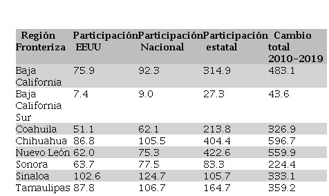 En el cuadro 3 aparecen los resultados de la región Fronteriza entre 2010 y 2019, se aprecia que las participaciones en todos los estados fueron positivos, que los montos mayores se obtuvieron en la participación estatal, siendo los estados más importantes Nuevo León, Chihuahua y Baja California, que también resultaron en el cambio total. Estos resultados denotan montos menos diferenciados entre ellos con excepción de Baja California Sur, se aprecia un mayor dinamismo de las remesas en los estados, lo cual muy probablemente está relacionado con migrantes circulares que mantienen un flujo de remesas más estable y continúo por su cercanía a la frontera, con grados de intensidad migratoria medio y hacia abajo.