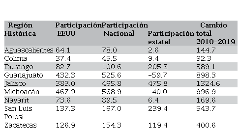 En la región Histórica, cuadro 2, compuesta por 9 estados de la República resalta lo que se observará al interior de todas las regiones, en el sentido de que la participación EEUU y la Nacional han sido positivas y ésta última la más importante. En esta región las participaciones Nacionales más altas fueron en los estados de Michoacán, Guanajuato y Jalisco. Pero en la participación estatal los más altos positivos fueron Jalisco 475.8 mdd, San Luis Potosí 239.4 mdd y Durango 205.8 mdd; con cifras negativas Guanajuato -59.7 mdd y Michoacán -40.0 mdd, nótese que fueron de los estados que más remesas recibieron. En el cambio total los menores montos fueron de Nayarit, Aguascalientes y Colima. Esta es la región que más remesas recibió en el conjunto del país, con la migración más antigua y la mayor intensidad migratoria.