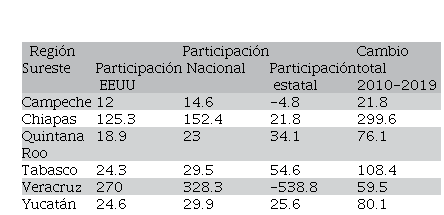 En la región Sureste todos los estados tuvieron aumento de remesas entre 2010 y 2019, ver cuadro 5 última columna, como en las regiones anteriores las participaciones EEUU y Nacional fueron positivas destacando Veracruz y Chiapas con los montos mayores. En la participación estatal 4 estados tuvieron ganancias en las remesas, en tanto que Veracruz y Campeche no, -538.8 mdd y -4.8 mdd respectivamente. En estos resultados destacan dos cuestiones, la caída tan fuerte de la participación estatal de Veracruz que es compensada en su mayor parte por las otras dos participaciones, y el mayor aumento de remesas del período en Chiapas. Probablemente relacionado con el mayor envío de remesas para familiares que entran a México para ir hacia el Norte.