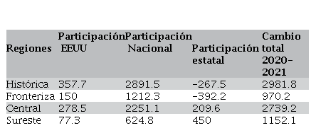 En la región Central, ver cuadro 9, las remesas aumentaron en los 9 estados; analizando las participaciones se presentó lo siguiente: en la participación EEUU y Nacional, las mayores participaciones fueron del Estado de México, la Ciudad de México, Guerrero, Oaxaca y Puebla. Sin embargo, la gran diferencia con el periodo 2010-2019 se encontró en la participación estatal, ya que en el periodo 2020-2021, aumentaron de 2 a 4 los estados con signo positivo, repitiendo la Ciudad de México 187.6 mdd, siguiendo Guerrero 130.1 mdd, el Estado de México 64.6 mdd y Morelos 38.4 mdd, en el resto la participación negativa fue mínima con excepción de Puebla que fue relativamente muy alta. La explicación tentativa en el caso de los positivos sería que sus migrantes enviaron remesas de lugares con menores afectaciones por la pandemia en los Estados Unidos, y lo contrario en los negativos. Aclaración, en todos los estados crecieron las remesas, esto se observa en la columna de Cambio total 2020-2021, pero en el caso de los estados con signo negativo su crecimiento fue menor, el ejemplo es Puebla, cuyos migrantes asentados en gran cantidad en la Ciudad de Nueva York y su zona Metropolitana, fueron afectados fuertemente por los contagios y las muertes por la pandemia, pero aun así recibió 158.1 mdd más.