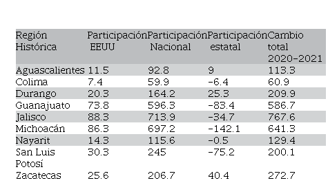 En 2020-2021 al interior de la región Histórica se presentaron los siguientes, ver cuadro 7. La participación EEUU fue muy menor, en tanto que la participación Nacional fue la más elevada en los 9 estados que conforman esta región, en una proporción de 8 a 1, todas con cifras positivas, destacando por su monto Jalisco, Michoacán y Guanajuato. Cabe recordar que esta misma situación y proporción se va a presentar en los demás estados de las regiones porque estas dos participaciones afectan por igual. Entonces la diferencia estuvo en la participación estatal, en ésta 6 de los 9 estados tuvieron cifras negativas, sólo fueron positivas en Zacatecas 40.4 mdd, Durango 25.3 mdd y Aguascalientes 9.0 mdd, que con relación al período anterior las positivas fueron 7, repitiéndose en las negativas Guanajuato y Michoacán, que en este segundo periodo fueron las más altas -142.1 mdd y -83.4 mdd, respectivamente. Estos resultados pueden tener una explicación en que se trata de los estados con mayor antigüedad en la migración, con circularidad, con flujos de remesas más estables, que cuando llega la pandemia los envíos que recibe crecen fuertementepero no tanto como en otros estados como se verá más adelante.
