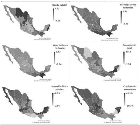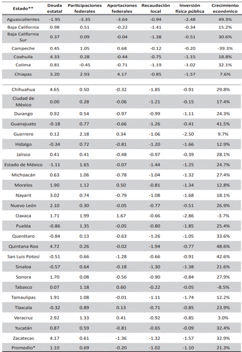 Los casos de Quintana Roo, Chihuahua y Coahuila contrastan con las situaciones anteriores, ya que fueron los estados con el mayor aumento en sus deudas estatales (figura 1 y Tabla 2), a pesar de registrar un crecimiento económico positivo del 48.6%, 29.8% y 18.8%, respectivamente, donde Quintana Roo fue el segundo estado que más creció durante el período de análisis. En los tres estados, tanto la recaudación local como la inversión física del sector público disminuyeron. La recaudación local disminuyó en 1.94, -1.85 y -0.75 puntos porcentuales de cada PIB estatal, mientras que la inversión física del sector público cayó en -0.77, -0.91 y -1.15 puntos porcentuales.
