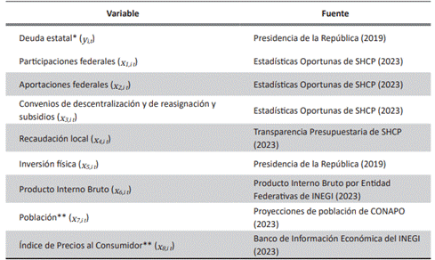 En esta investigación, se emplea un conjunto de datos de panel que abarca el período de 2007 a 2019 e incluye a las 32 entidades federativas de México. Este intervalo temporal abarca dos acontecimientos exógenos importantes. Primero, el declive del PIB en 2009, que resultó en una disminución del 6.3% en términos reales (Fondo Monetario Internacional, 2024). Segundo, la promulgación de la Ley de Disciplina Financiera en 2016, diseñada para restringir el incremento de la deuda subnacional. La elección de concluir el período de muestra en 2019 se fundamenta en la intención de evitar cualquier anomalía derivada de la pandemia, la cual se propagó a nivel nacional a partir de 2020 (Gobierno de México, 2023). La tabla 1 muestra las variables escogidas y las fuentes de información.