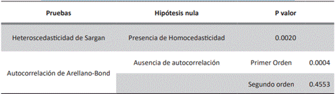 Por último, para para añadir un componente dinámico a las regresiones y probar el factor inercial en la evolución de la deuda, se calcula el modelo de Arellano-Bond. Para garantizar que este modelo provea estimaciones confiables se realizan las pruebas de heteroscedasticidad de Sargan y de autocorrelación de Arellano-Bond. Aunque el modelo padece heteroscedasticidad (tabla 5) se calculan estimaciones robustas a ella (Das, 2019: 556-558; Stata, 2023). Pasando a la autocorrelación, la prueba de Arellano-bond indica ausencia autocorrelación de segundo orden (tabla 5), mientras que la de primer orden es un resultado esperado y no problemático porque se incluyó la variable dependiente con un rezago como variable