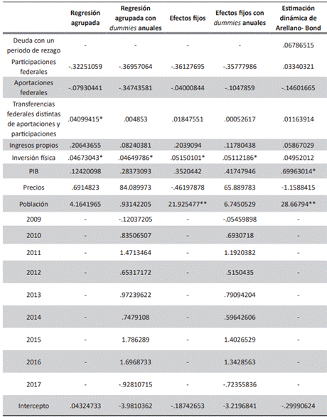 La inversión física (x5,i t) se refiere a los proyectos productivos implementados por el gobierno estatal. Según la Ley de Disciplina Financiera, los estados y municipios deben utilizar la deuda para financiar inversión productiva y en cubrir insuficiencias temporales de liquidez. Por lo tanto, se espera una relación positiva entre la deuda estatal y la inversión física.