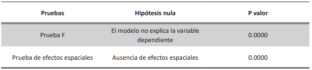 El modelo de regresión agrupada supone efectos individuales constantes a lo largo de todas las unidades de corte transversal. No obstante, si existe heterogeneidad entre estas unidades, los estimadores pueden verse sesgados, y para contrarrestar posibles regresiones espurias, se requiere instrumentalizar los efectos fijos (Das, 2019; Stock y Watson, 2020). Para verificar la relevancia de usar regresiones agrupadas o efectos fijos se calculó la prueba de efectos espaciales la cual indica que es preferible usar efectos fijos, pues el p valor es cero y se rechaza la hipótesis nula de ausencia de efectos espaciales (Das, 2019: 505). Además, la prueba F muestra un p valor igual a cero por lo que se rechaza la hipótesis nula de que el modelo no explicar la variable dependiente (tabla 3) (Stopck y Watson, 2020).