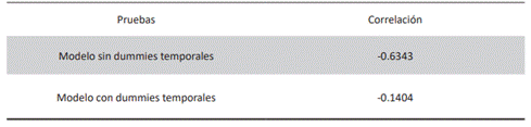 Se calcularon dos modelos de efectos fijos. El primero sin dummies temporales y otro con ellas. Se descarta el modelo sin dummies tempo rales porque su correlación es de -0.6343. En cambio, el modelo de efectos fijos con dummies temporales tienen una correlación de -0.1404. Lo anterior se hizo debido a que el modelo con correlación más baja genera estimaciones más certeras (Stock y Watson, 2020) (tabla 4).