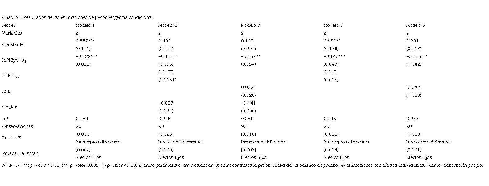 Tras realizar el análisis gráfico de las variables, a fin de conocer la distribución regional e individual de estas, se presentan las estimaciones de las ecuaciones de β-convergencia condicional, bajo la metodología de datos de panel cuyos resultados se pueden apreciar en el cuadro 1.1