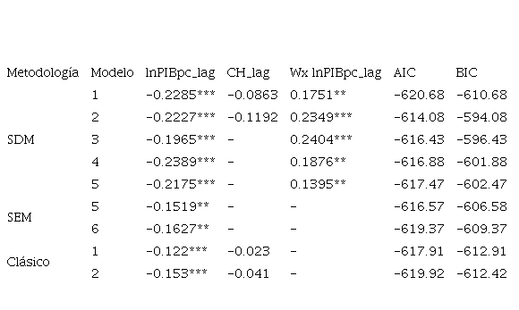 Por otro lado, Mendoza y Valdivia (2016) investigan la β-convergencia condicional a través de la metodología panel espacial con efectos fijos individuales y aleatorios, para las 32 entidades federativas de México y una muestra de 30 entidades (excluyen a Tabasco y Campeche) en el periodo 2001-2010. Precisan procesos de β-convergencia condicional para las dos muestras y sub-periodos analizados, a su vez localizan que los años de escolaridad tienen una fuerte influencia sobre el crecimiento económico y la convergencia, de la misma manera las remesas. Otro de los aspectos relevantes es que, aunque hay procesos de convergencia donde la heterogeneidad y dependencia son relevantes, se ha tendido hacia la polarización regional.