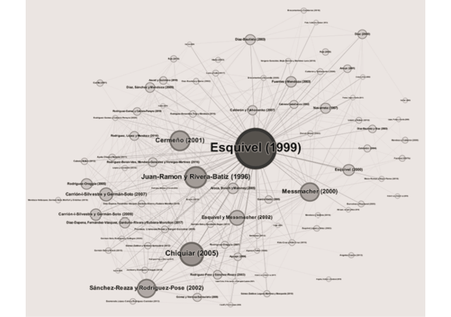La difusión y divulgación son importantes para construir conocimiento y permiten reforzar o refutar los trabajos publicados. Se realizó un análisis de la producción científica por la citación entre los investigadores de los 88 trabajos seleccionados, a fin de conocer cuáles son los autores más citados (figura 2). El número de citas que recibe un artículo nos permite identificar las publicaciones más influyentes en un área de investigación. Los cinco trabajos con mayor cantidad de citas de la muestra analizada corresponden a Esquivel (1999), Chiquiar (2005), Juan-Ramón y Rivera-Batiz (1996), Cermeño (2001) y Messmacher (2000).