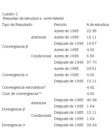 En el cuadro 2 se presenta un resumen de los resultados de los estudios a nivel estatal, observando que 36.06% de los estudios analizados señalan que existe convergencia absoluta antes de la apertura comercial, ya sea que tomen como punto de corte el año 1985 o el año 1995. De igual forma, 42.62% de los estudios señalan que en el periodo posterior a la apertura comercial se presentó divergencia absoluta. Debido a que cada estudio analiza diferentes periodos se trataron de englobar estos en periodos de antes y después de la apertura comercial