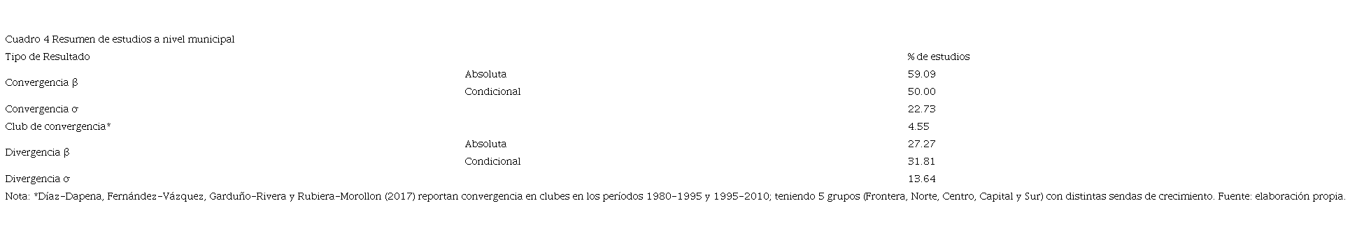 La mayoría de los estudios reportan convergencia a nivel municipal. En el cuadro 4 se presenta un resumen de los resultados de los estudios a este nivel, se observa que 59.09% de los estudios señalan la existencia de convergencia absoluta y 50% de los estudios dan como resultado convergencia condicional. Los estudios a este nivel se realizan principalmente después de 1988, porque son los datos que generalmente se tienen disponibles. Por lo general, los análisis se realizan tomando como muestra la mayoría de los municipios de México.