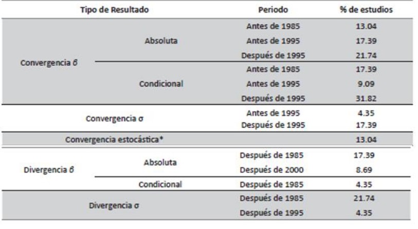 Moncayo (2004) en su revisión de la literatura de convergencia económica llega a la conclusión de que durante la posguerra las regiones pobres estaban convergiendo a las ricas. Sin embargo, después de la década de los ochenta se inicia un proceso de divergencia económica en la mayoría de las economías.