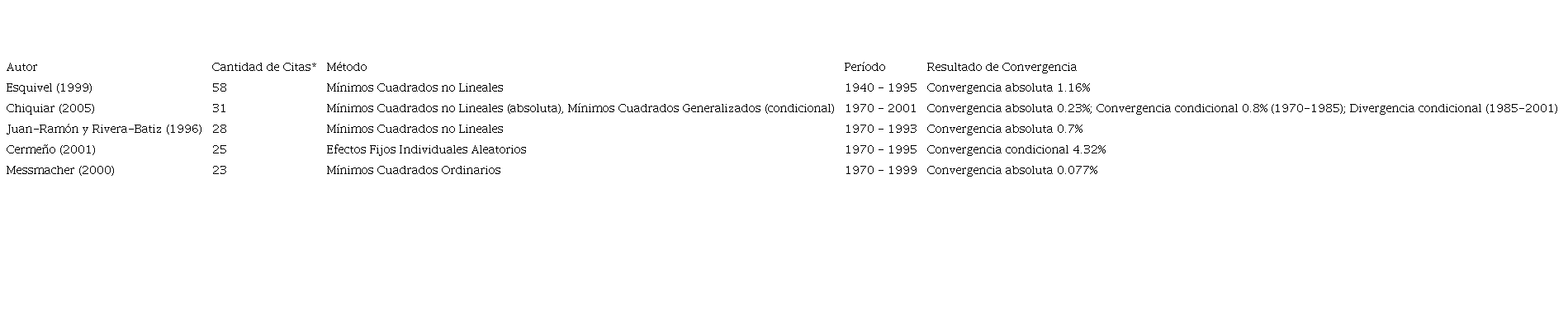 El trabajo de Esquivel (1999) presenta evidencia de convergencia absoluta entre 1940 y 1995, esta convergencia ocurrió a una tasa de 1.16% anual. Como señala el mismo autor, esta tasa es una de las más bajas estimadas a nivel de regiones dentro de un país, siendo comparable únicamente con Italia. Asimismo, Chiquiar (2005) obtiene resultados de convergencia absoluta en el periodo 1970-2001; en cambio para la convergencia condicional se presenta evidencia de convergencia en el periodo 1970-1985 y de divergencia de 1985 a 2001. En el estudio de Juan-Ramón y Rivera-Batiz (1996) el resultado de convergencia es estadísticamente insignificante lo que indica una convergencia absoluta débil durante el periodo 1970-1993. Por su parte, Cermeño (2001) utilizó modelos dinámicos de panel sin regresores exógenos, encontrando evidencia de convergencia condicional en el periodo 1970-1995. Messmacher (2000) encuentra evidencia a favor de un proceso de convergencia; sin embargo, señala que el resultado obtenido proporciona poca evidencia de que las disparidades regionales del ingreso per cápita se hayan cerrado durante el periodo 1970-1999.