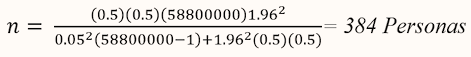 Para calcular la muestra se consideró a la Población económicamente activa (PEA), que fue de 58.8 millones (INEGI, 2021). El tamaño fue calculado a partir de la ecuación 1.