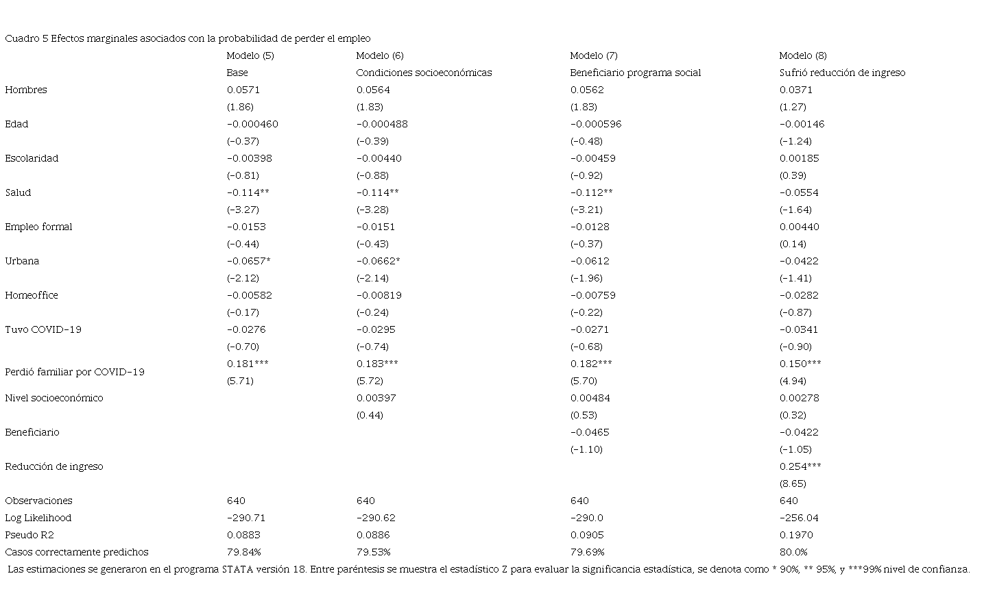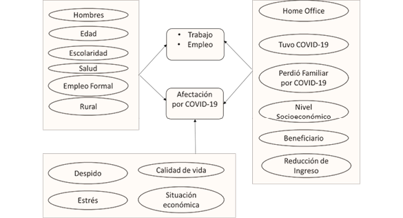 El análisis econométrico se realizó a través de un Modelo Probit binomial, para calcular la probabilidad de que la persona se encuentre trabajando, la probabilidad de perder el empleo, y las afectaciones sobre el bienestar, para ello se consideraron las variables de condiciones socioeconómicas como el sexo del encuestado, la edad, su escolaridad en años, si tiene acceso a los servicios de salud, si tiene un empleo formal, si vive en el ámbito rural o urbano, si trabaja desde casa (home office), si tuvo COVID-19, si perdió algún familiar por COVID-19, su nivel socioeconómico, si es beneficiario de algún programa social, y si tuvo alguna reducción en su ingreso.