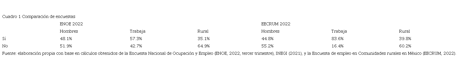 Los resultados obtenidos, utilizando la base de datos de la EECRUM 2022, permitió tener información en retrospectiva de lo que vivieron las personas durante la pandemia por COVID-19, y los efectos sobre su calidad de vida que identifican entre los meses de mayo a septiembre de 2022. La encuesta se aplicó en 16 entidades federativas: Baja California, Chiapas, Ciudad de México, Estado de México, Guanajuato, Guerrero, Hidalgo, Jalisco, Michoacán, Morelos, Oaxaca, Puebla, Querétaro, Quintana Roo, Tlaxcala, y Zacatecas. La encuesta logró capturar las respuestas de 640 personas. Del cuadro 1 se muestra que la ECCRUM tiene un mayor porcentaje de personas que forman parte de la PEA, 83.6%, en comparación con la ENOE 2022, que es de 57.3% que trabajan.