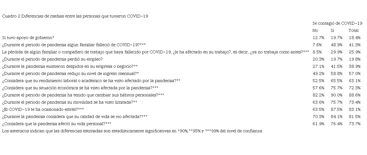 En general, se infiere que 72.3% de las personas encuestadas tuvieron una afectación en su situación económica por la pandemia, se estima un porcentaje superior para los que tuvieron COVID-19, 75.7%, y menor para los que no se enfermaron, 57.6%. Una gran parte de la población encuestada, 88.6%, declaró que tuvo que cambiar sus hábitos personales, un mayor porcentaje entre las personas tuvieron COVID-19, 90%, en comparación al 82.2% que no tuvieron. Por otra parte, 73.4% de los encuestados también declararon que tuvieron una reducción en su movilidad, la cual fue mayormente reducida por los que tuvieron COVID-19, cifra estimada en 75.7%, en tanto, los que no enfermaron, el 63.6% mencionaron haber tenido una reducción en su movilidad. Estos datos proporcionan evidencia de que los efectos adversos en el empleo y calidad de vida se amplifican si las personas se contagiaron por COVID-19. Las personas que se contagiaron por COVID-19 refirieron tener mayor estrés y que su vida personal también cambió; la mayoría de las variables del cuadro 2 son estadísticamente significativas, solo no se encuentran diferencias entre las personas que viven en zonas urbanas y rurales, o si perdieron el empleo.