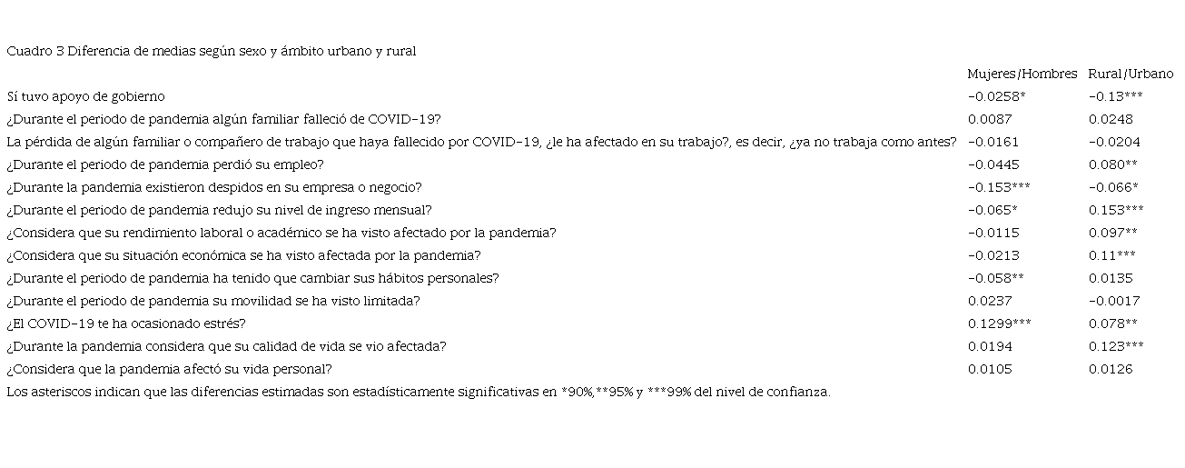 El cuadro 3 muestra dos columnas con las diferencias en las afectaciones que sufrieron las personas distinguiendo entre hombres y mujeres y la diferencia de medias entre el ámbito rural y urbano. A continuación, se mencionan las diferencias que resultaron estadísticamente significativas, se encuentra que son los hombres quienes recibieron, en mayor proporción que las mujeres, los programas sociales, mismos que están mayormente disponibles en el ámbito urbano. El porcentaje de personas que perdió el empleo fue mayor en el ámbito urbano, si bien, los hombres, en comparación de las mujeres fueron quienes mayormente declararon haber perdido el empleo, la diferencia no fue estadísticamente significativa. Los despidos fueron mayormente mencionados por los hombres y principalmente en el ámbito urbano. Las reducciones en el ingreso y las afectaciones en las condiciones socioeconómicas, debido al COVID-19, fueron afectaciones referidas principalmente por los hombres, y en mayor medida en el ámbito rural.