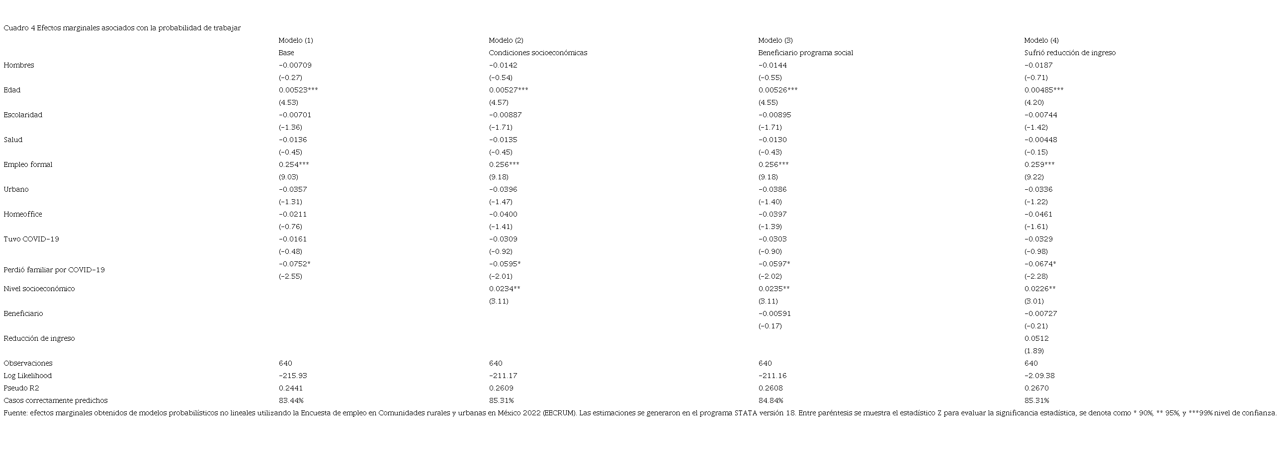 Por otra parte, el efecto más significativo es si tiene un empleo formal pues esto aumenta la probabilidad de que trabaje en alrededor de 25 puntos porcentuales (pp), con respecto a los trabajadores informales, lo que es consistente con la evidencia de Antipova (2021). Se infiere, que el ámbito en el que vive no influye en la probabilidad de trabajar, aunque contrasta con la evidencia de Afifi et al. (2022) en donde sí encuentran diferencias en el ámbito rural y urbano. Tampoco resulta relevante el hecho de trabajar desde casa, ni siquiera si tuvo COVID-19, el trabajar de forma remota pudo propiciar la continuación de la relación laboral (Ibarra Muñoz et al., 2022). Sin embargo, un efecto que es robusto es que las personas que declararon que perdieron un familiar por COVID-19 son más propensas a no trabajar, pues la probabilidad se reduce entre 5 y 7 puntos porcentuales, lo que podría estar relacionado con la incertidumbre, miedo o frustración (Brooks et al., 2020), o bien, por el sentimiento de pérdida que aún después de la pandemia les sigue afectando (Van Schaik et al., 2022). Un mayor nivel socioeconómico está asociado a una mayor probabilidad de trabajar, lo que también se relaciona con la desigualdad existente entre regiones (Afifi et al., 2022). En tanto, ser beneficiario de algún programa social parece reducir la probabilidad de trabajar, pero este efecto no es estadísticamente significativo, así también el efecto de la reducción del ingreso, aunque aumentaría la probabilidad de trabajar, no es significativo