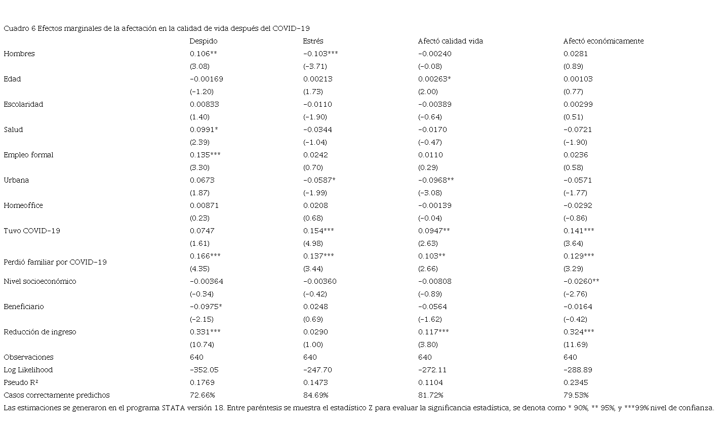 Por otra parte, en tiempos de COVID-19 era más probable que los hombres fueran despedidos, en comparación con las mujeres, y conforme aumentaba la edad, las personas declaraban una mayor afectación en la calidad de vida. En general, se estimaron efectos que se amplificaron con la pandemia por COVID-19, pues las personas con menores ingresos tuvieron una mayor afectación en su economía familiar.
