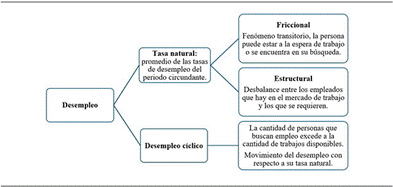 El estudio económico del desempleo se ha dividido en tasa natural y desempleo cíclico. La tasa natural es aquella que existiría en una economía si no se presentaran recesiones, ni expansiones, se le conoce como tasa de equilibrio. Se calcula tomando el promedio de las tasas de desempleo de los periodos analizados, eliminando el componente cíclico. La tasa natural se descompone en desempleo friccional y estructural (Jones, 2017). El friccional se da porque la economía es dinámica y los trabajadores tienden a cambiar de empleo. Es un fenómeno transitorio, la persona puede estar a la espera de trabajo o se encuentra en su búsqueda, se debe a las asimetrías de información en el mercado de trabajo (Mankiw, 2014). Proviene de un desbalance entre la oferta y la demanda de mano de obra, puede ser voluntario (OIT, 2003).