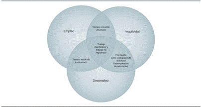 con la subutilización de las capacidades productivas de los trabajadores y repercute en la disminución del bienestar. Los trabajadores pasan de un empleo ocasional al siguiente, en el intervalo pierden recursos económicos y tiempo (OIT, 2003). Algunos otros, pueden tener un empleo de larga duración, pero estar insertos en trabajos peligrosos y sin protección social. La calidad del empleo se ve afectada desde dos vertientes, desde la oferta y la demanda. En términos de la demanda con la informalidad y, desde la oferta con el empleo vulnerable (Ortiz et al., 2007). En la literatura empírica se ha encontrado que las variables que tienen una relación inversa con el empleo vulnerable son la escolaridad y la experiencia, a mayor escolaridad menor probabilidad de insertarse en el empleo vulnerable. Aquellas que se relacionan directamente son: el género femenino, la jefatura del hogar, el estrato socioeconómico bajo y medio, la edad, los trabajos por cuenta propia, el empleo doméstico, los trabajos familiares y agrícolas (Cerquera-Losada et al., 2020). En la figura 2 se ilustran los elementos donde confluyen el empleo, la inactividad y el empleo.