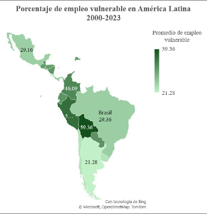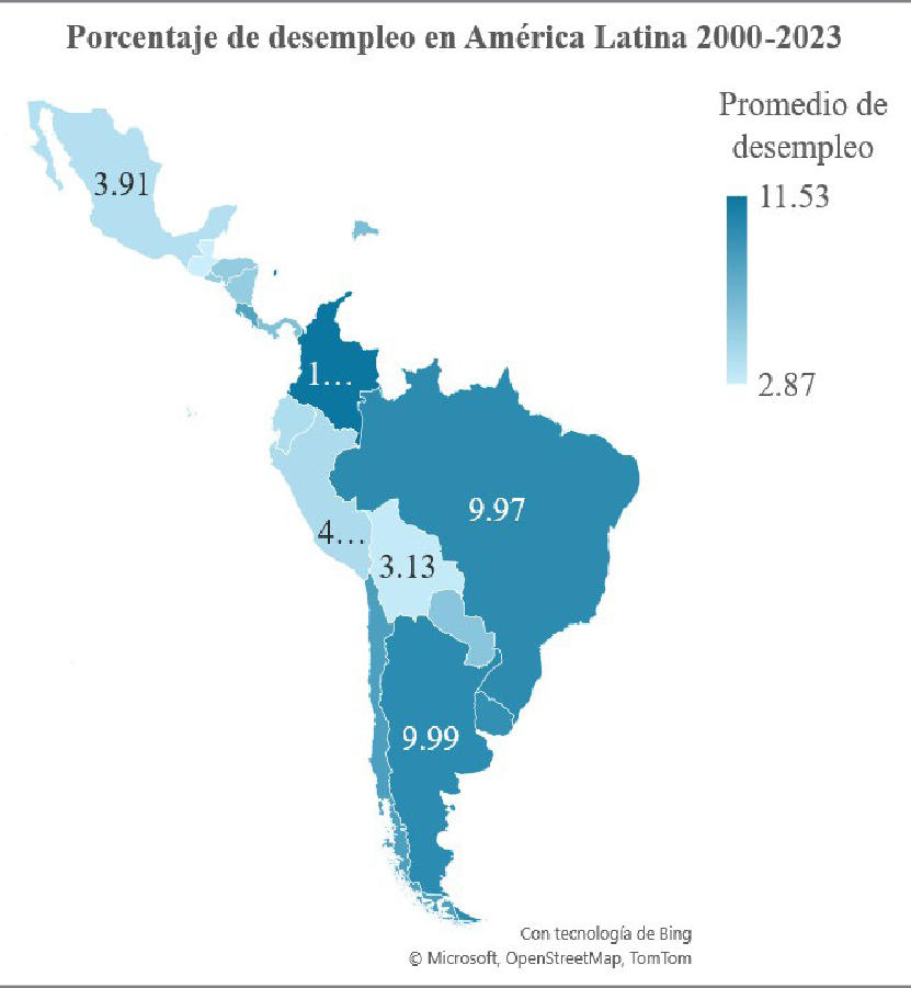 En la figura 3 se muestra la media del desempleo en América Latina, de 2000 a 2023. El país con menor porcentaje de desempleo es Guatemala con 2.87 %. La nación con mayor porcentaje de desempleo es Colombia, con 11.53 %. México muestra una media de 3.91 % para el periodo de estudio. En la figura 4 se muestra la media de empleo vulnerable en América Latina, de 2000 a 2023. El país con mayor porcentaje de empleo vulnerable es Bolivia con 59.36 %. Por su parte, Argentina es la nación con el menor porcentaje de empleo vulnerable con 21.28 %. México tiene una media de 29.16 %.