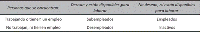 1) no se tiene un empleo remunerado y no se trabaja por cuenta propia. 2) La persona debe encontrarse disponible para trabajar en un empleo remunerado o por cuenta propia. 3) Que se encuentren buscando empleo, de manera que hayan realizado gestiones para obtenerlo (OIT, 2003). En la tabla 1 se muestra la medición de la fuerza de trabajo.